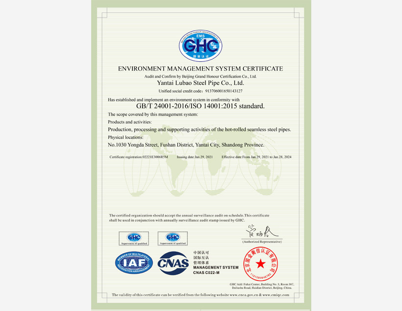公司管理體系取得API Q1、ISO 9001、ISO 14001、ISO 45001和ISO 50001標準認證證書,實驗室取得ISO/IEC 17025認可證書。